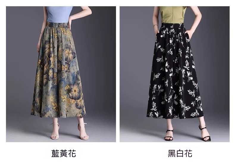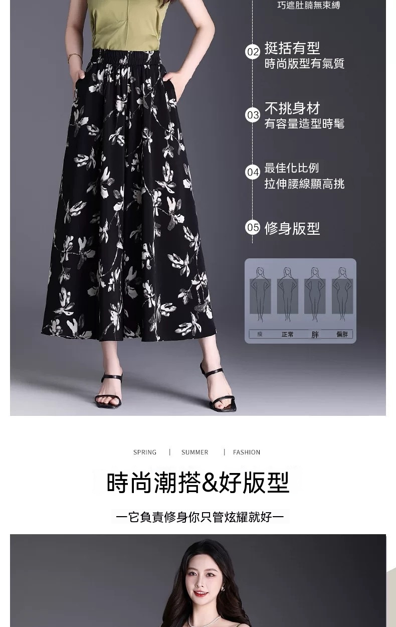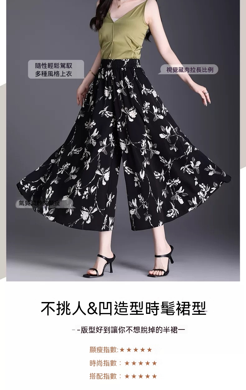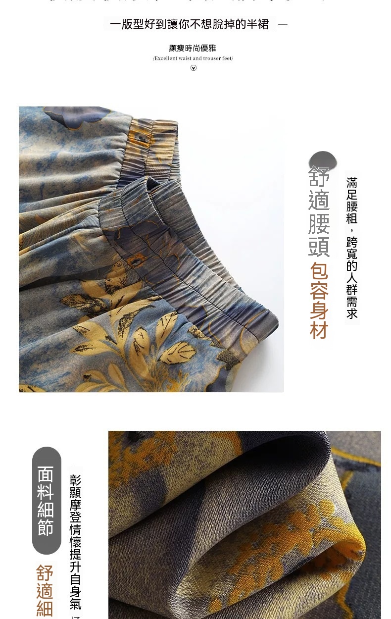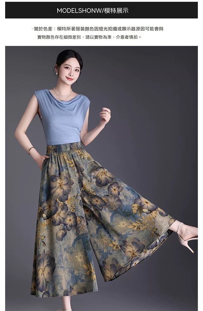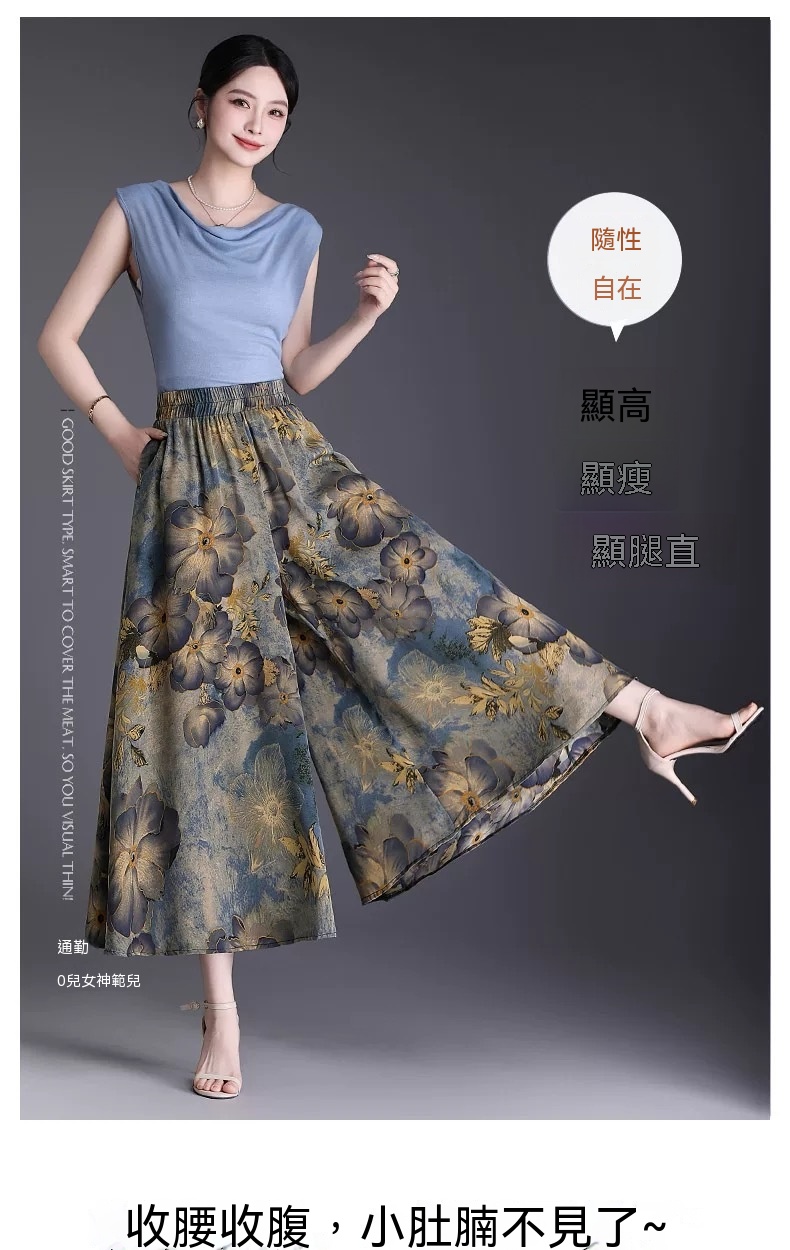 高彈鬆緊腰不挑身材,闊腿版型遮肉顯瘦,水墨花紋復古高級,垂感飄逸透氣舒適