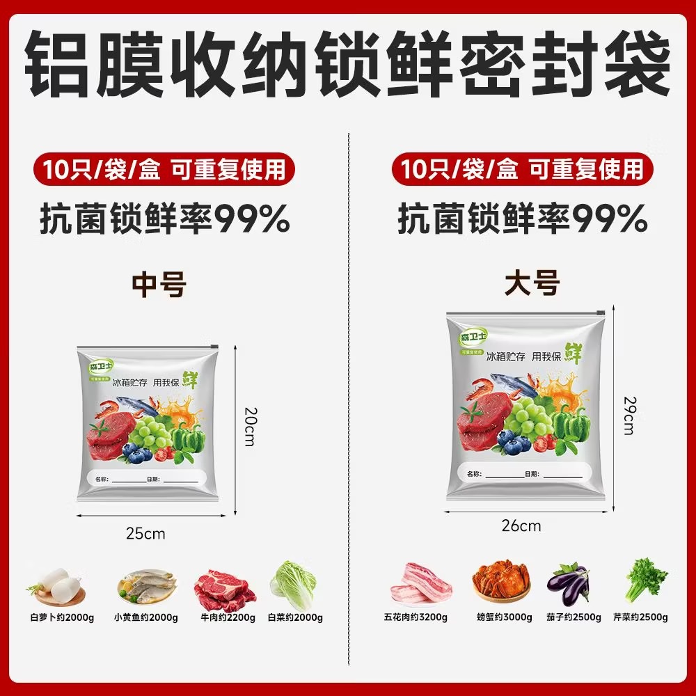 一秒鎖鮮黑科技,鎖住食材本味,延長保鮮期,超大容量實用,肉類、海鮮、蔬果都能裝,滿足全家需求,可重複使用環保